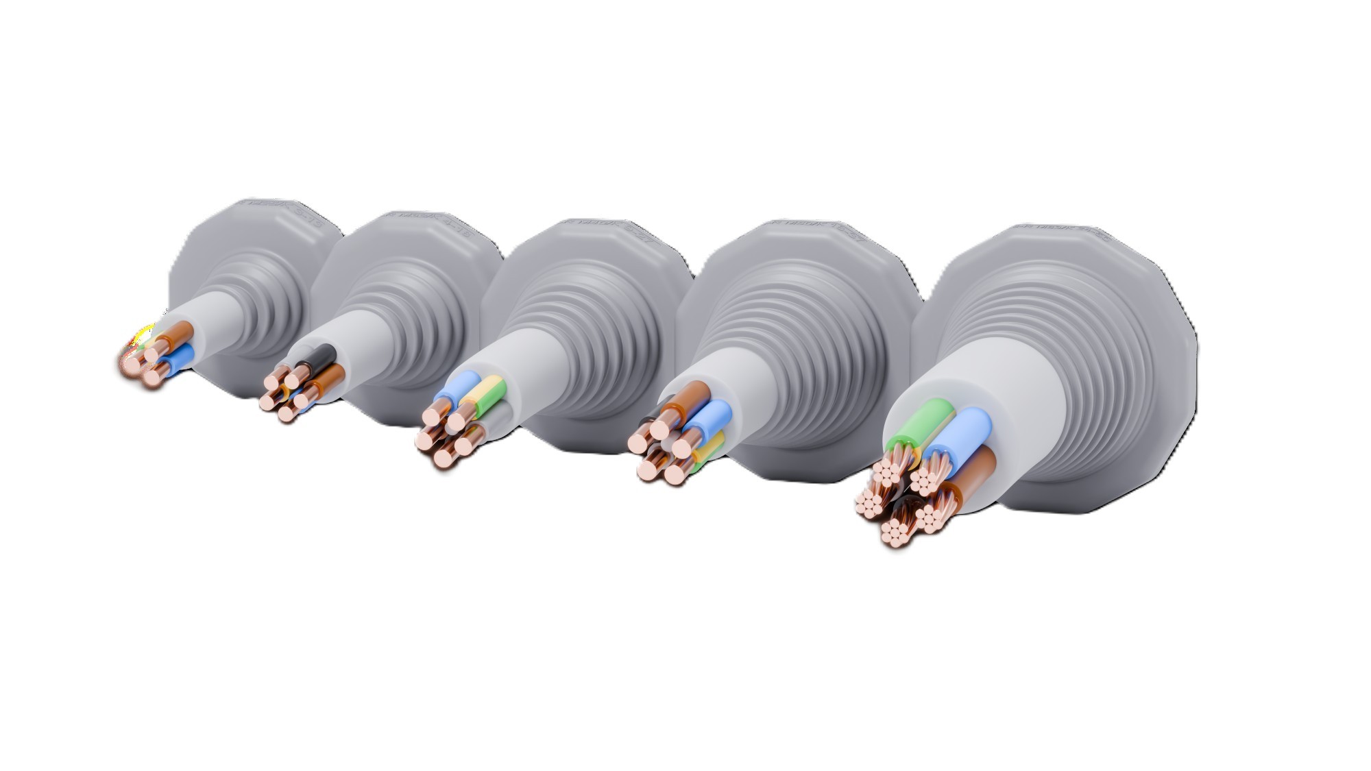 Die teilbaren Mehrfach-Kabeldurchführungen verfügen über einen robusten, brandhemmenden Kunststoff-Rahmen und entsprechen den üblichen Ausschnittmaßen und Bohrbildern im Schaltschrank- und Maschinenbau. Im größten Rahmen mit Nenngröße 24 können bis zu 40 Kabel kombiniert werden. Dabei steht eine breite Auswahl an geteilten Tüllen zur Verfügung: Die kleinen Tüllen sind für Kabel mit einem Durchmesser von 2 bis 17 mm geeignet, während die großen Tüllen Kabel mit bis zu 35 mm aufnehmen können. Standardmäßig sind Tüllen mit 1, 2 und 4 Öffnungen erhältlich, und Doppelmembranen sorgen für eine sichere Dichtheit der Systeme.