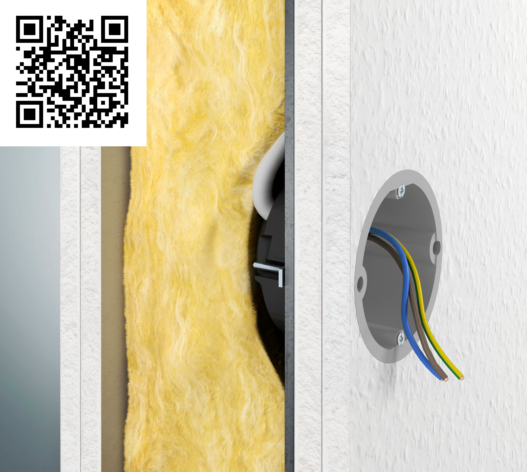 KAISER-Strahlenschutzdosen für bleikaschierte Strahlenschutzwände absorbieren Röntgenstrahlung mit einem Bleigleichwert von 2,5 mm Pb (QR-Code zur Produktanimation auf Youtube)
