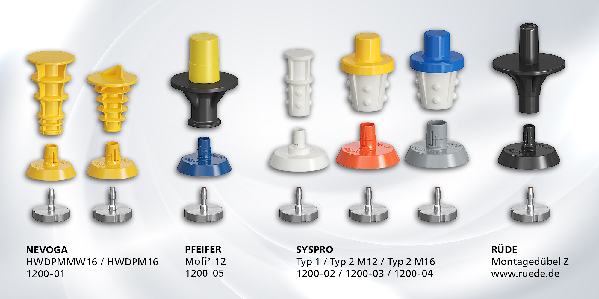 Über die Elektroinstallation hinaus bietet KAISER jetzt auch für Schrägstützenanker und Montagedübel diverse System-Haftmagnet-Adapter an. Damit können in der werksseitigen Vorfertigung weitere wichtige Bauteile per System-Haftmagneten automatisch in Betonfertigteilen platziert werden. Alle marktüblichen Schrägstützenaufnahmen lassen sich mittels Schalungsroboter exakt auf dem Schaltisch positionieren und zum Betonieren in das Betonfertigteil einbetten. Auf Zug und Druck belastbare Schrägstützen kommen während der Montage auf der Baustelle mindestens zu zweit pro Wandelement zum temporären Abstützen und Justieren zum Einsatz. Hierzu werden die Stützen im oberen Drittel des Betonfertigteils in der Aufnahme verankert. Die sechs neu entwickelten, schutzrechtlich angemeldeten System-Haftmagnet-Adapter für die Schrägstützenbefestigung sind im oberen Bereich exakt an die Innenkontur der jeweiligen Schrägstützenanker der Hersteller Nevoga, Pfeifer, Rüde und Syspro angepasst. Die passgenaue Form sorgt nach dem Aufsetzen auf den System-Haftmagneten für eine stabile und sichere Verbindung. Zugleich wird der Magnet zuverlässig vor dem umfließenden Beton geschützt und der Anker beim Betonieren vor einem möglichen Aufschwimmen bewahrt. Auf diese Weise tragen die neuen Adapter zu einer erhöhten Sicherheit und Präzision der Schrägstützenbefestigung bei. Durch eine innovative Verriegelung, die nach dem Aufsetzen der Schrägstützenaufnahme wirksam wird, ist der bündige Halt auf der Stahlschalung gewährleistet. Dichtlippen verhindern ein Unterfließen der Betonmilch. Durch ihre konische Kontur verbleiben die Adapter nach dem Ausschalen auf dem System-Haftmagneten und können leicht wieder entnommen werden. Die Befestigungsstellen im Fertigteil werden nach der Nutzung verspachtelt oder mittels eines Kunststoff- bzw. Sichtbetonstopfens der Schrägstützenanker-Hersteller verschlossen. So bleibt die auf der Stahlschalung entstandene gleichmäßige Oberfläche erhalten. Die Adapter sind farblich den jeweiligen Schrägstützenanker-Herstellern zugeordnet, um den Mitarbeitenden im Fertigteilwerk einen leichteren Überblick zu verschaffen.